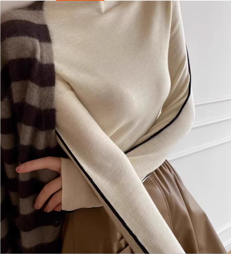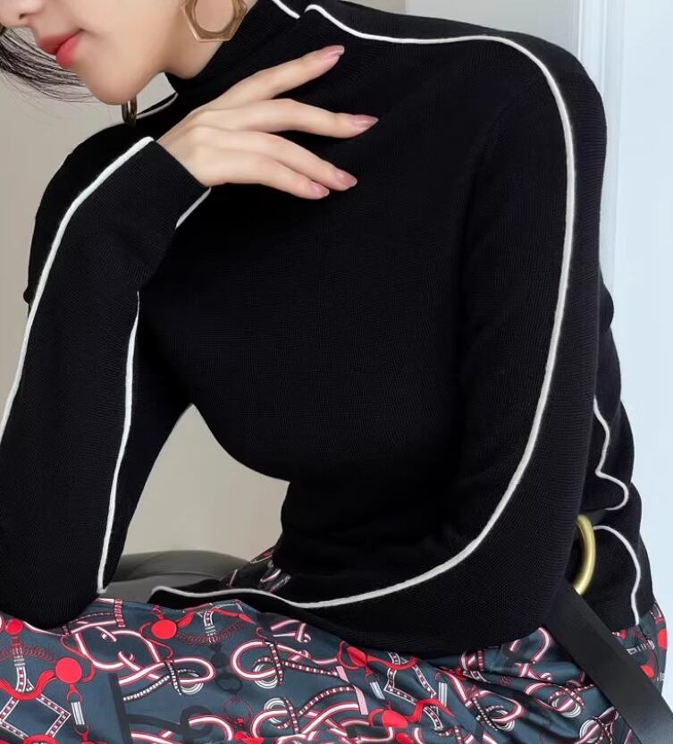 TO004 / 配色ライン 長袖 タートルネック ニット / アクセントになる配色ラインが、シンプルながらも個性を演出します。カジュアルなデニムから、きれいめなスカートまで、幅広いアイテムと相性抜群。